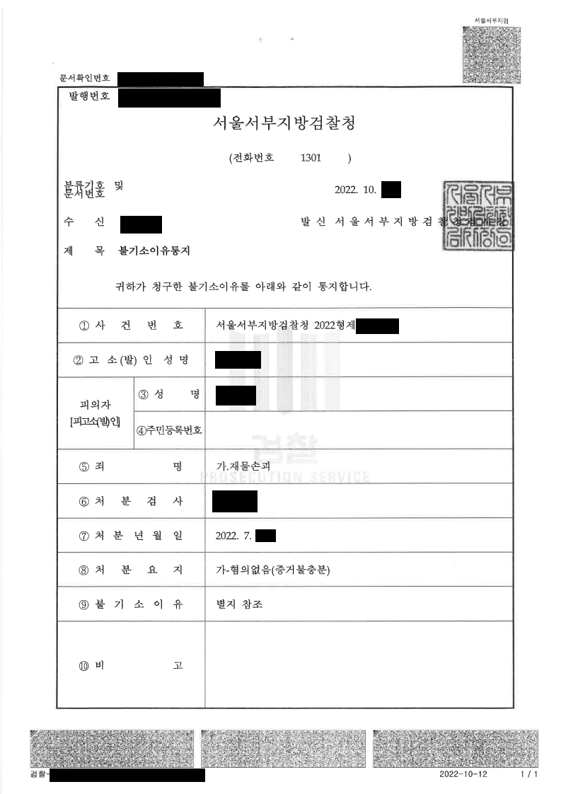 검찰은 고의로 손괴한 증거가 없고, 관리인의 직무 수행 과정이었다는 점을 인 정하여 ‘혐의 없음’ 불기소 처분을 내렸습니다. 본 사건은 건물 내 시설관리 책임자가 직무를 수행하는 과정에서 형사적 책임을 지지 않도록 방어한 대표 적 사례로, 관리주체가 공익적 목적에서 한 조치임을 구체적으로 소명한 점에 서 실무상 큰 의의가 있습니다.